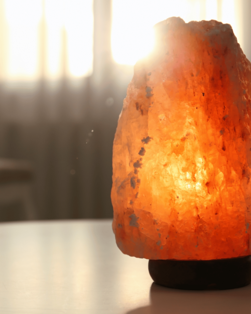 Warm licht van een rode Himalaya zoutlamp ('s nachts aanlaten).